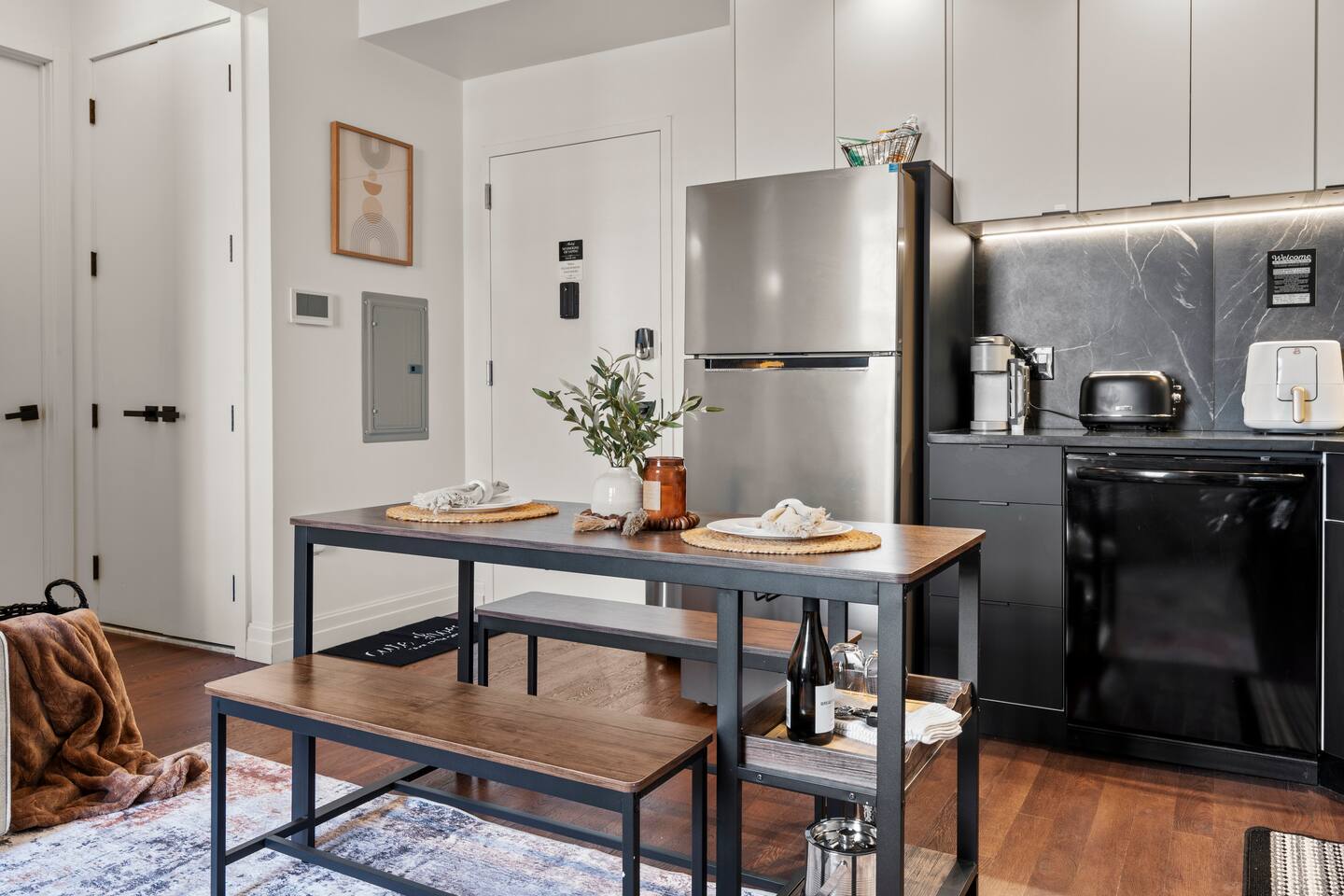 Important Notes: • 🅿️ Parking Pass: The provided parking pass must be returned to the unit upon checkout. If the pass is not returned, a $75 replacement fee will be charged • 📹🔒 Security: The building is secure, with security cameras in common areas. The unit is equipped with an external front Ring doorbell camera that records audio and video footage for guest safety and property security • ☕ Supplies: A starter supply of complimentary coffee, tea, creamer, sugar, toilet paper, and paper towels is provided. Guests are responsible for replenishing items as needed during their stay • 📬 Mail: Please do not have mail or packages sent to the property, as guests do not have access to the mailbox • ⏰ Check-In / Check-Out: Complimentary early check-in at 3:00 PM (one hour early) may be available. Earlier check-ins or late check-outs can be accommodated for an additional fee of $15 per half hour, subject to availability. Please request at least 24 hours in advance. 🚉 Urban residential neighborhood with moderate traffic noise. 🛏️ Queen air mattress available that sleeps 1 person