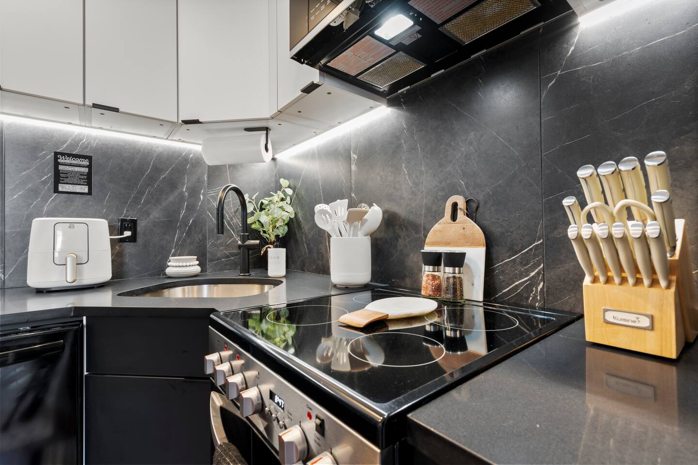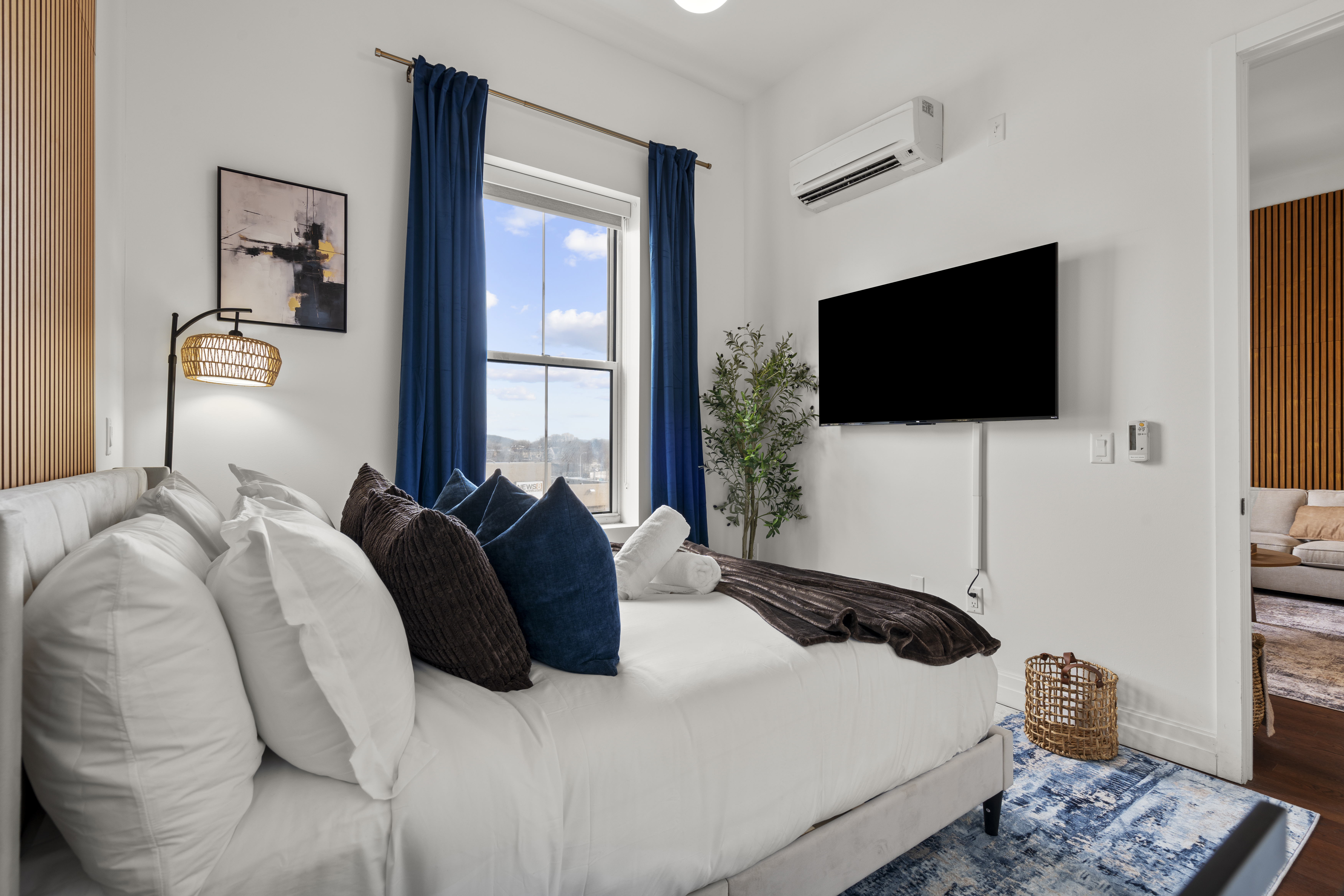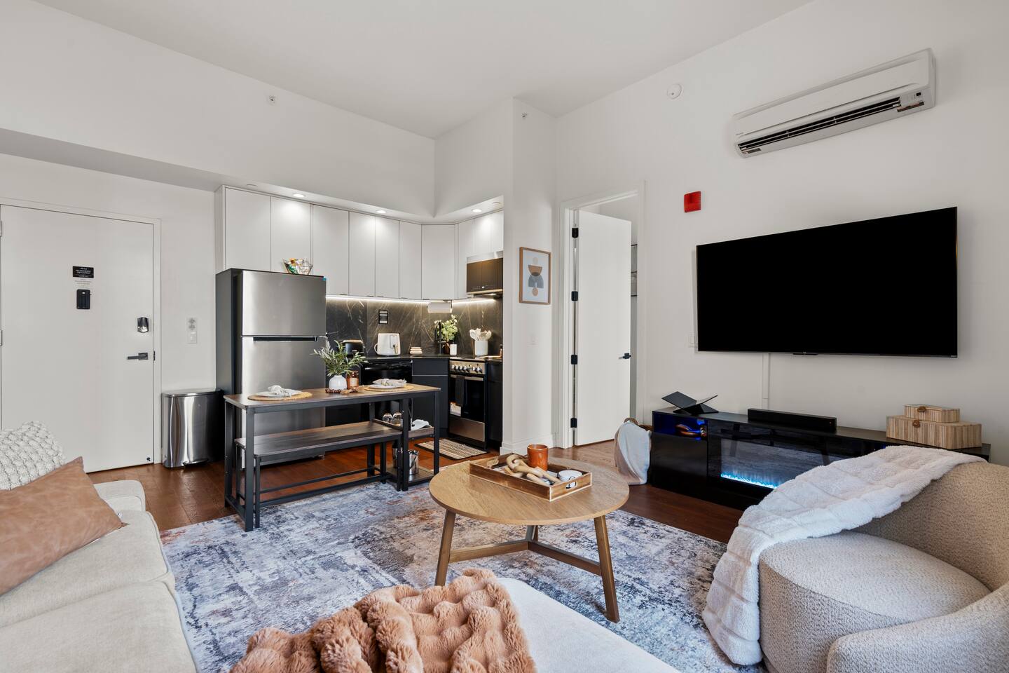 Discover stylish city living in this newly renovated 2-bedroom, 2-bathroom apartment, perfectly located for exploring the best of New Haven. With sleek finishes and an unbeatable location, this space offers the ideal blend of modern comfort and convenience for up to 5 guests. Apartment Highlights: • 🛋️ Living Area: An open-concept space bathed in natural light, featuring a comfortable sectional sofa (🛏️ queen air mattress available), a 65-inch TV with soundbar, and a dedicated dining area • 🍳 Kitchen: Fully equipped with modern stainless steel appliances—perfect for preparing meals at home • 🛏️ Bedrooms: Two inviting bedrooms, each with a queen bed, plush bedding, and blackout curtains. The primary bedroom includes a private en-suite bathroom and TV (55-inch). • 🚿 Bathrooms: Two full bathrooms for added convenience—one with a walk-in shower and the other with a relaxing bathtub • 💻 Workspace: A dedicated workstation with desk and chair, ideal for remote work or study In-Unit Amenities: • 🧺 Washer and dryer • 🎲 Board games and cards • 🧴 Towels, hairdryers, and starter shower essentials