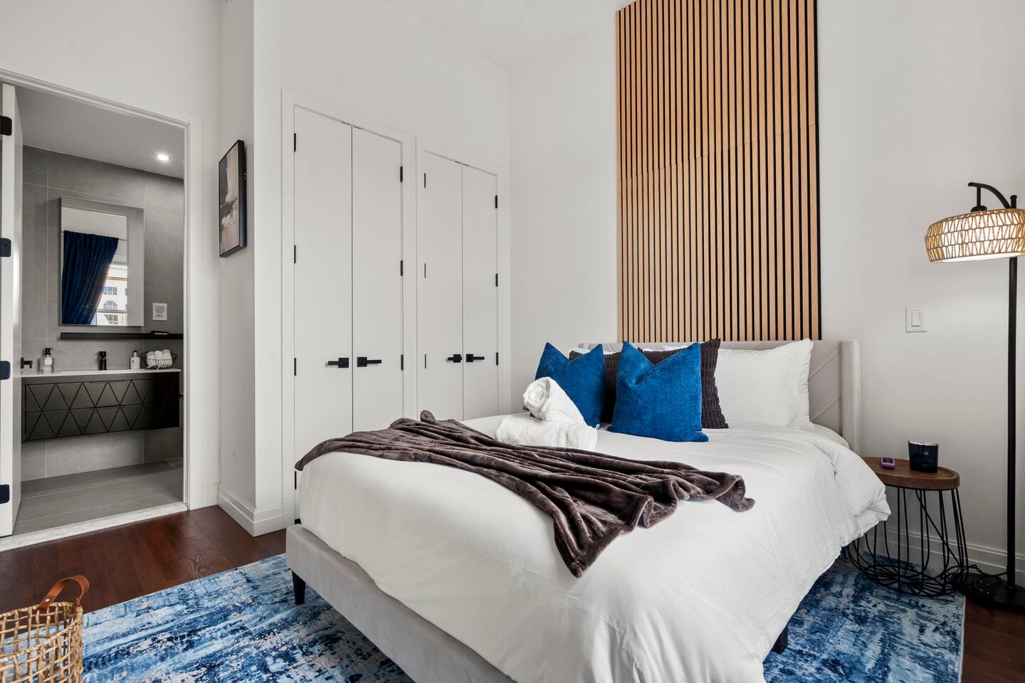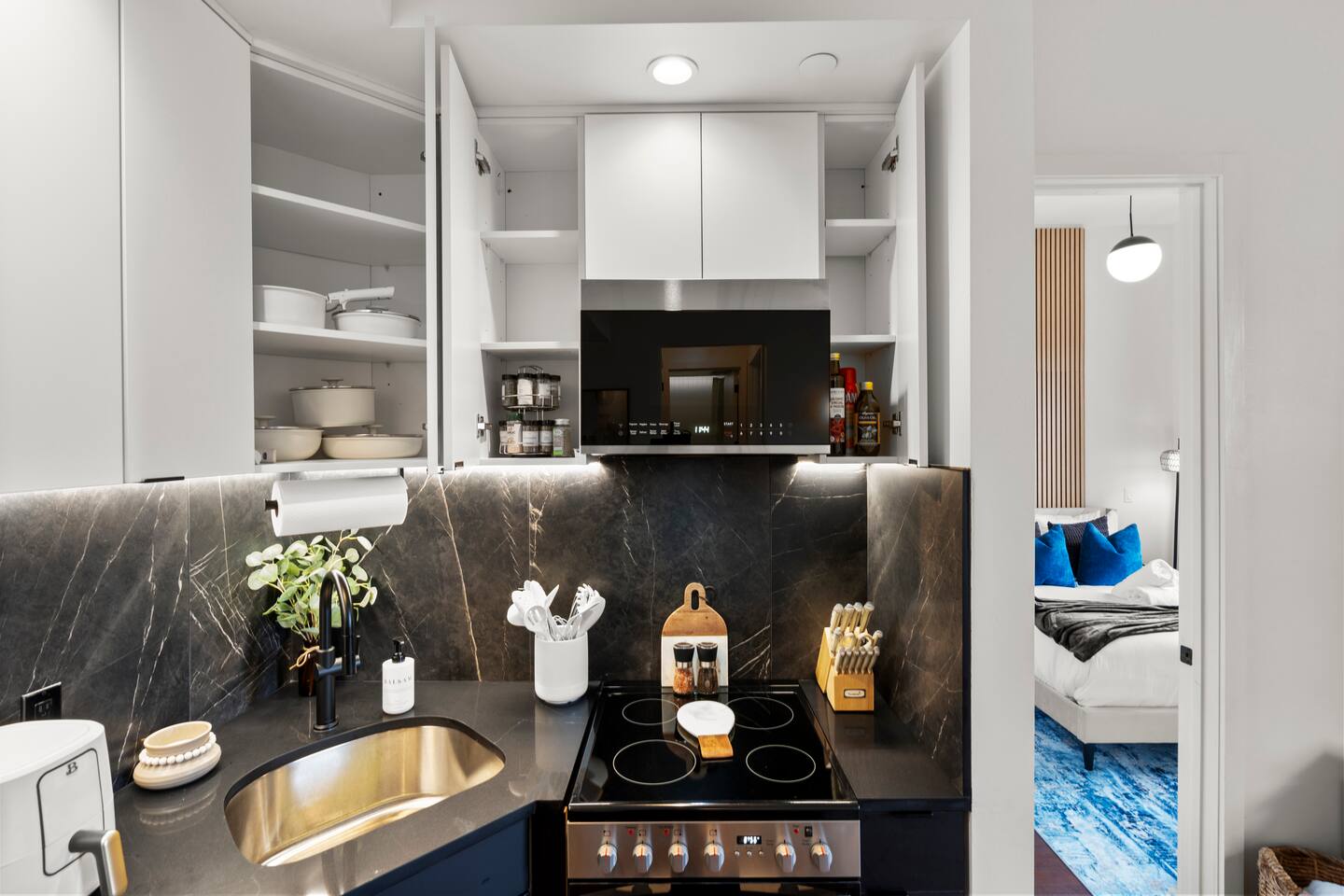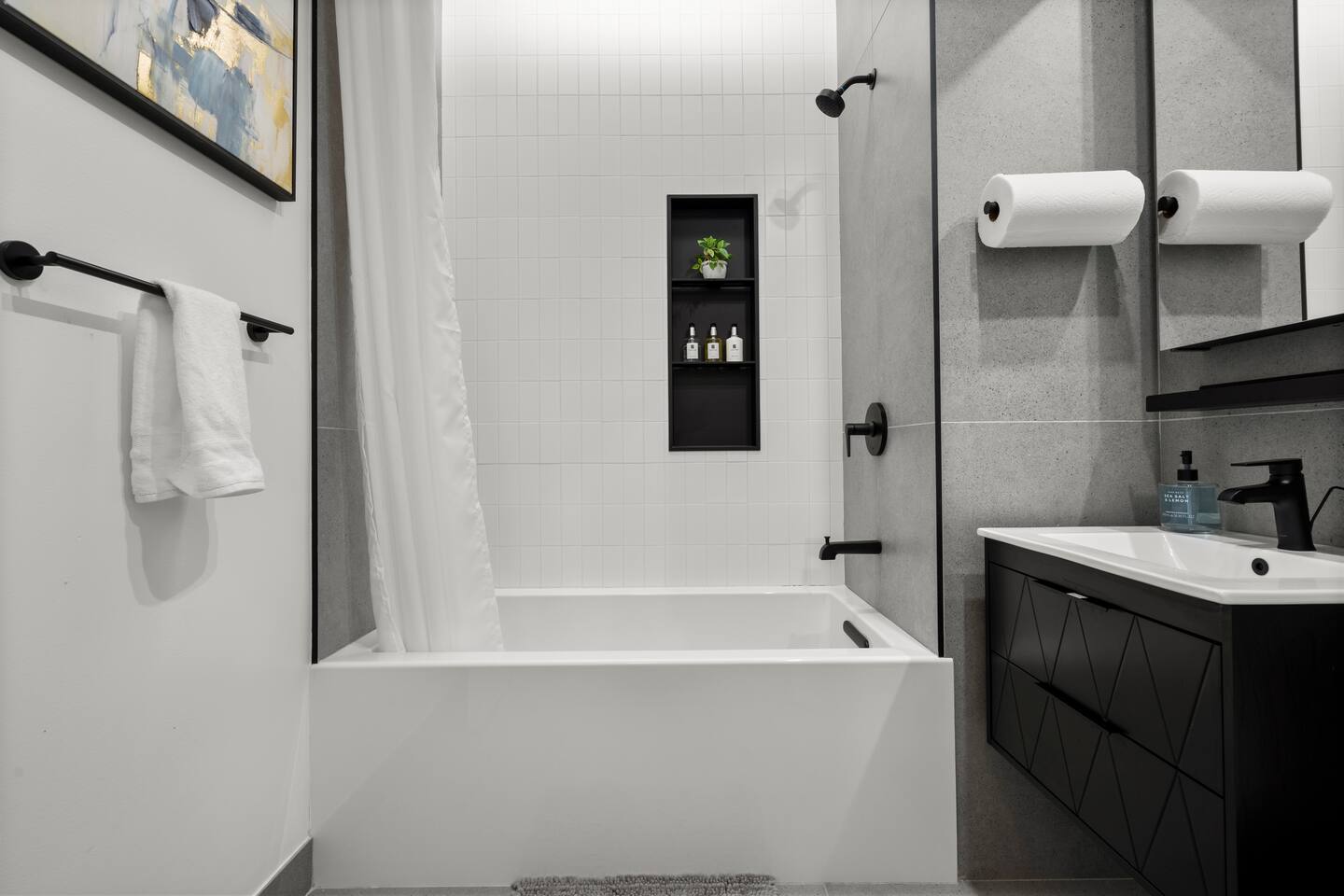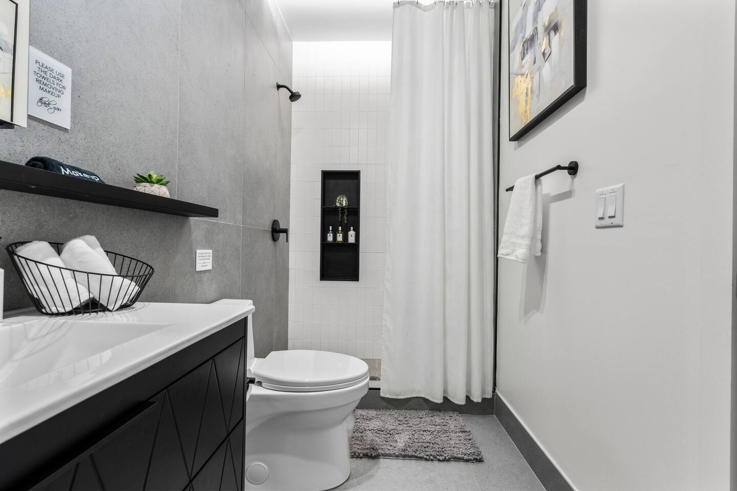 Discover stylish city living in this newly renovated 2-bedroom, 2-bathroom apartment, perfectly located for exploring the best of New Haven. With sleek finishes and an unbeatable location, this space offers the ideal blend of modern comfort and convenience for up to 5 guests. Apartment Highlights: • 🛋️ Living Area: An open-concept space bathed in natural light, featuring a comfortable sectional sofa (🛏️ queen air mattress available), a 65-inch TV with soundbar, and a dedicated dining area • 🍳 Kitchen: Fully equipped with modern stainless steel appliances—perfect for preparing meals at home • 🛏️ Bedrooms: Two inviting bedrooms, each with a queen bed, plush bedding, and blackout curtains. The primary bedroom includes a private en-suite bathroom and TV (55-inch). • 🚿 Bathrooms: Two full bathrooms for added convenience—one with a walk-in shower and the other with a relaxing bathtub • 💻 Workspace: A dedicated workstation with desk and chair, ideal for remote work or study In-Unit Amenities: • 🧺 Washer and dryer • 🎲 Board games and cards • 🧴 Towels, hairdryers, and starter shower essentials